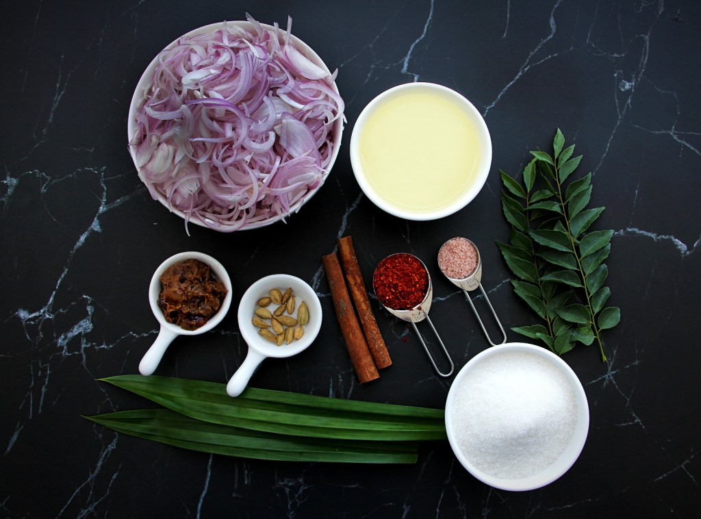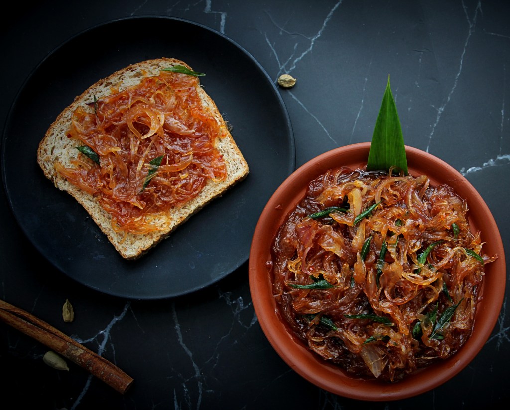 Seeni sambol is a very popular side dish in Sri Lanka. It’s a flavourful side, which can also be used as a spread or a filling, with any type of bread, crackers, hoppers, roti, string hoppers or rice. It is essentially caramelised onion with sweet, tangy and a touch spicy flavours with a lot of natural aroma using the popular Sri Lankan spices such as curry leaves, pandan leaves, cardamom and cinnamon. When you make this seeni sambol at home you can smell this aroma for few hours in your kitchen.