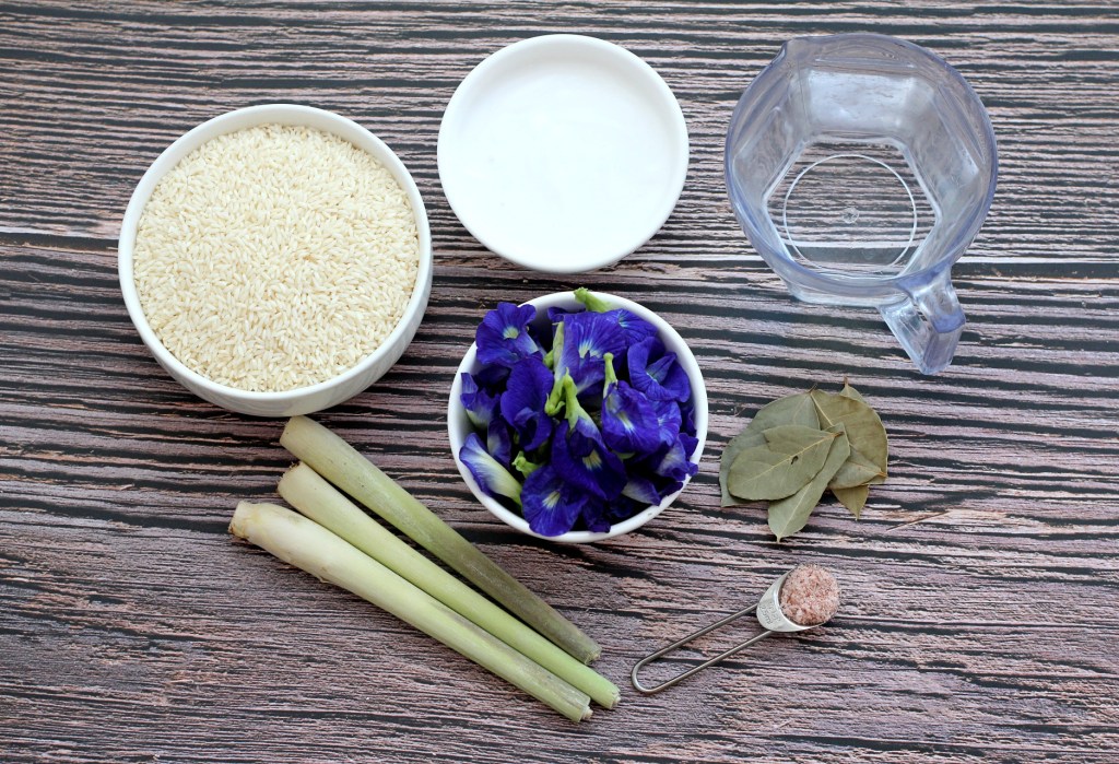 - Wash and rinse the rice and add with water, salt, pandan leaves, bay leaves, coconut milk and pea flower juice into a rice cooker.